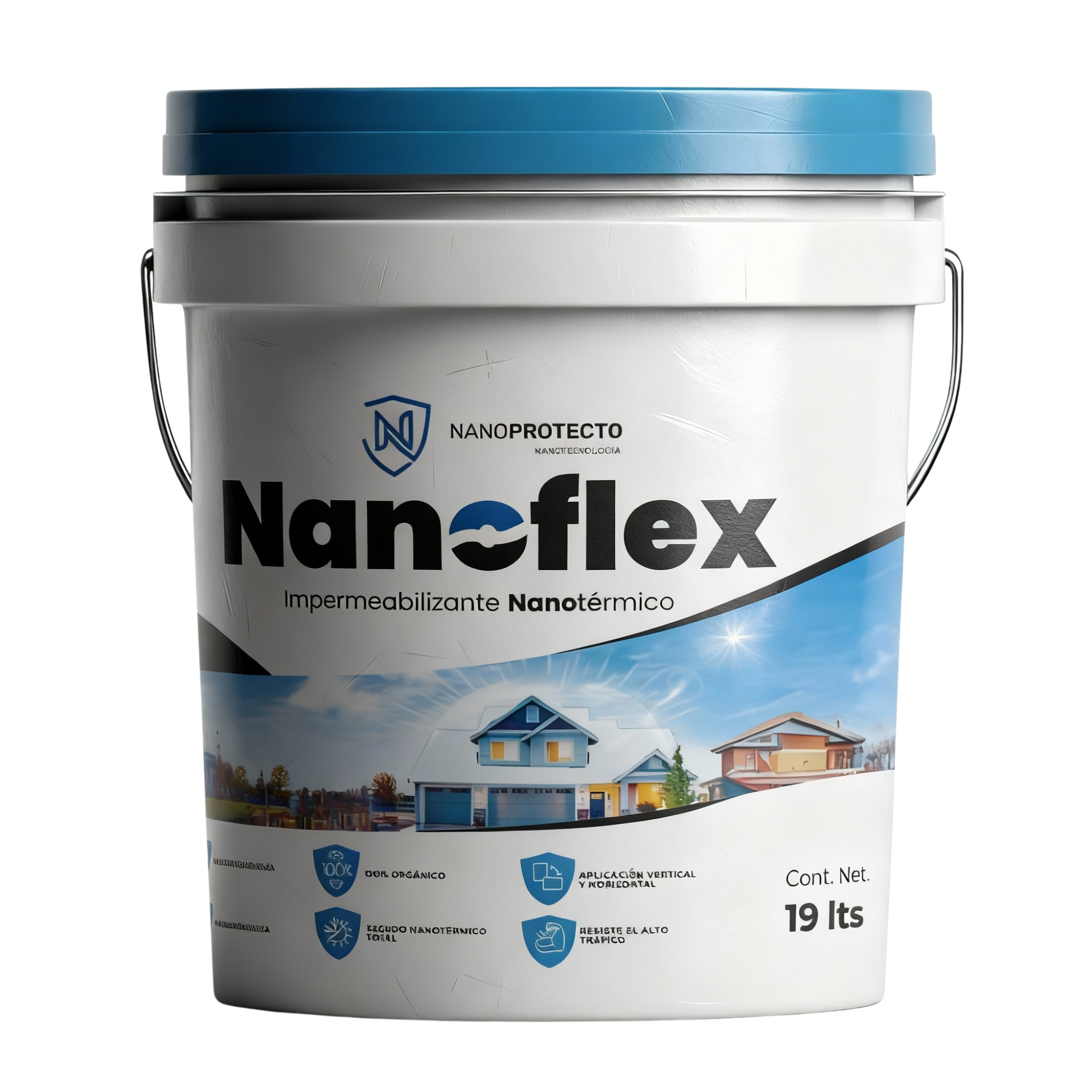 NANOFLEX Impermeabilizante y escudo térmico. Ideal para fachadas y muros exteriores e interiores. Repelente a la humedad, salitre y hongos. Escudo térmico UV total, hasta 30° de diferencia en superficie caliente / fría. NANOFLEX está hecho a base de bionanotecnología de última generación, libre de gases VOC y tóxicos, que protege el techo, muros o pisos de la humedad impidiendo el paso de la misma. Este producto es también un repelente de rayos UV y radiación solar, impidiendo el paso del calor a través de la superficie protegida por el producto. El rendimiento es de 19 a 40 metros cuadrados por cubeta. Detiene la corrosión y degradación. Aplicable con pistola, brocha, rodillo, etc. No requiere malla. Adherible a cualquier superficie. Se puede aplicar en capas anteriores. Secado en 60 minutos.