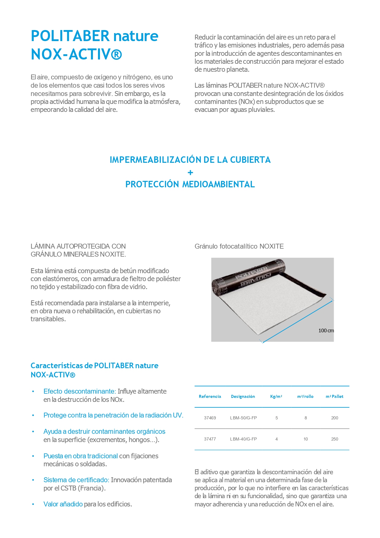 Esto convierte a la cubierta en una superficie activa descontaminante, contribuyendo a mejorar la calidad del aire en entornos urbanos e industriales.
