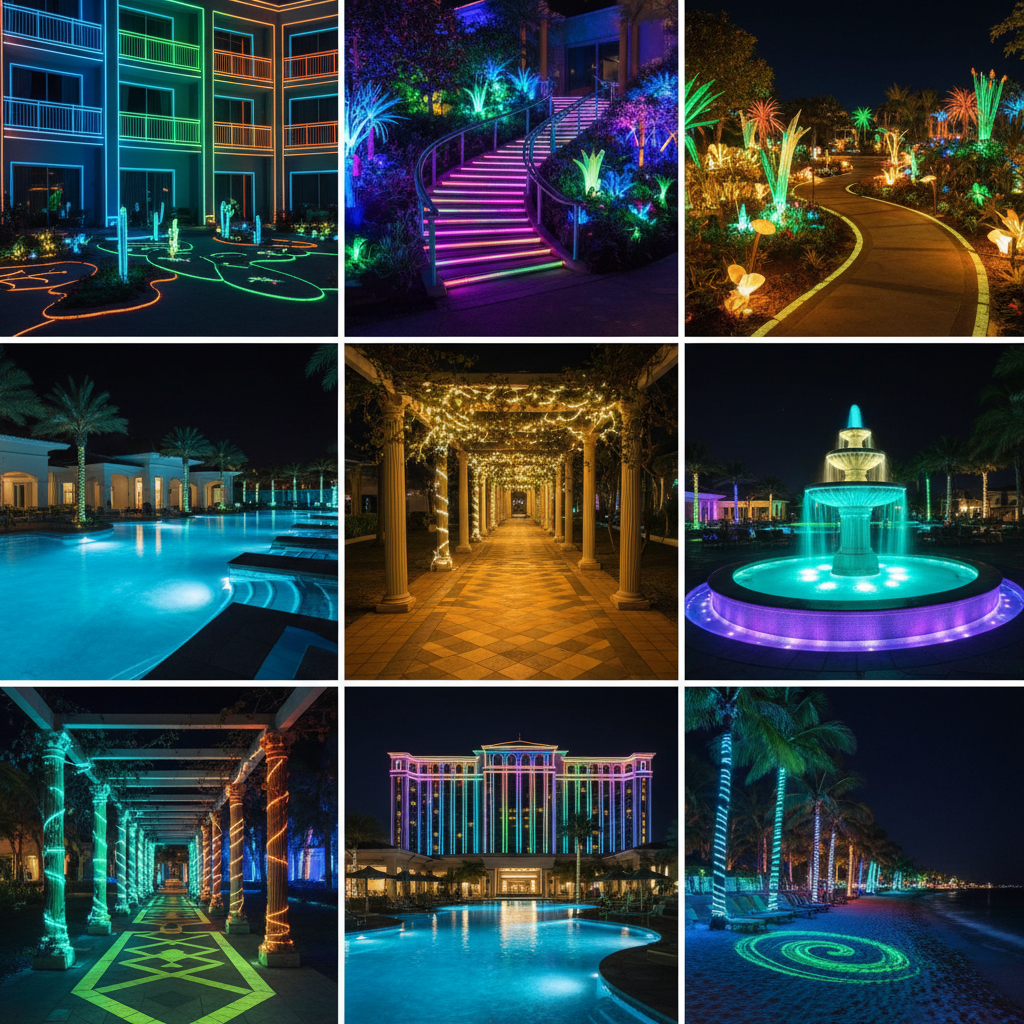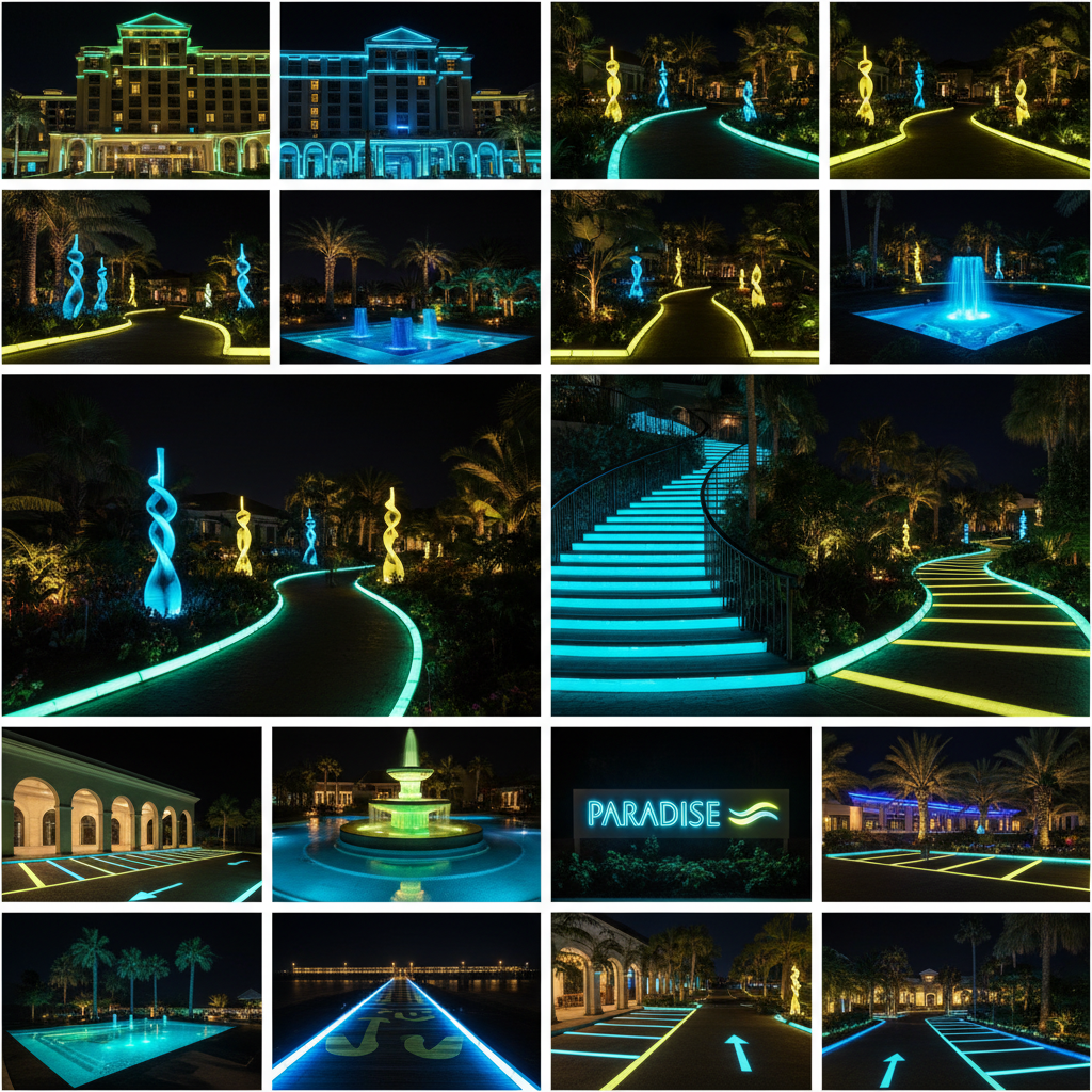 – Decoración luminosa en fachadas, muros, esculturas y pisos